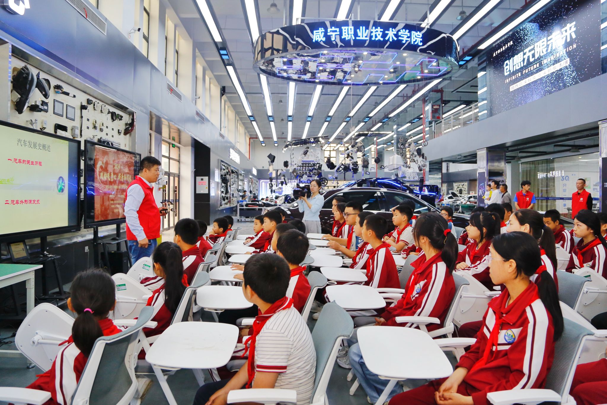 6月5日,咸宁市科协、咸安区政协联合77779193永利官网组织大幕乡金鸡山小学的47名同学,走进77779193永利官网新产业公共实训基地新能源汽车实训中心,开展科普活动。