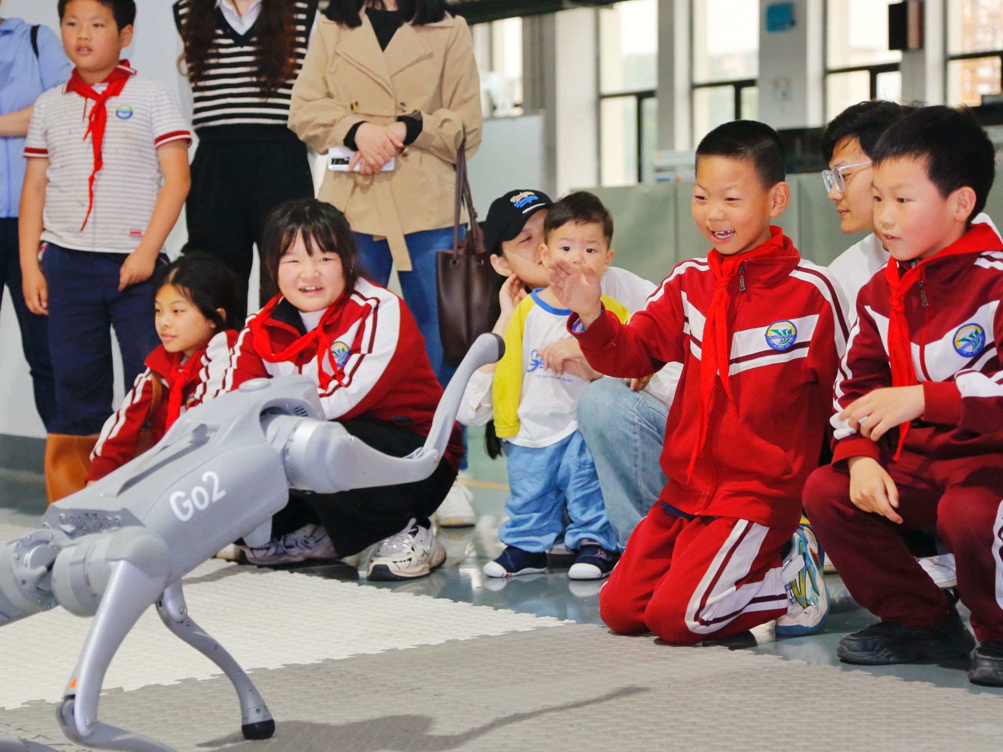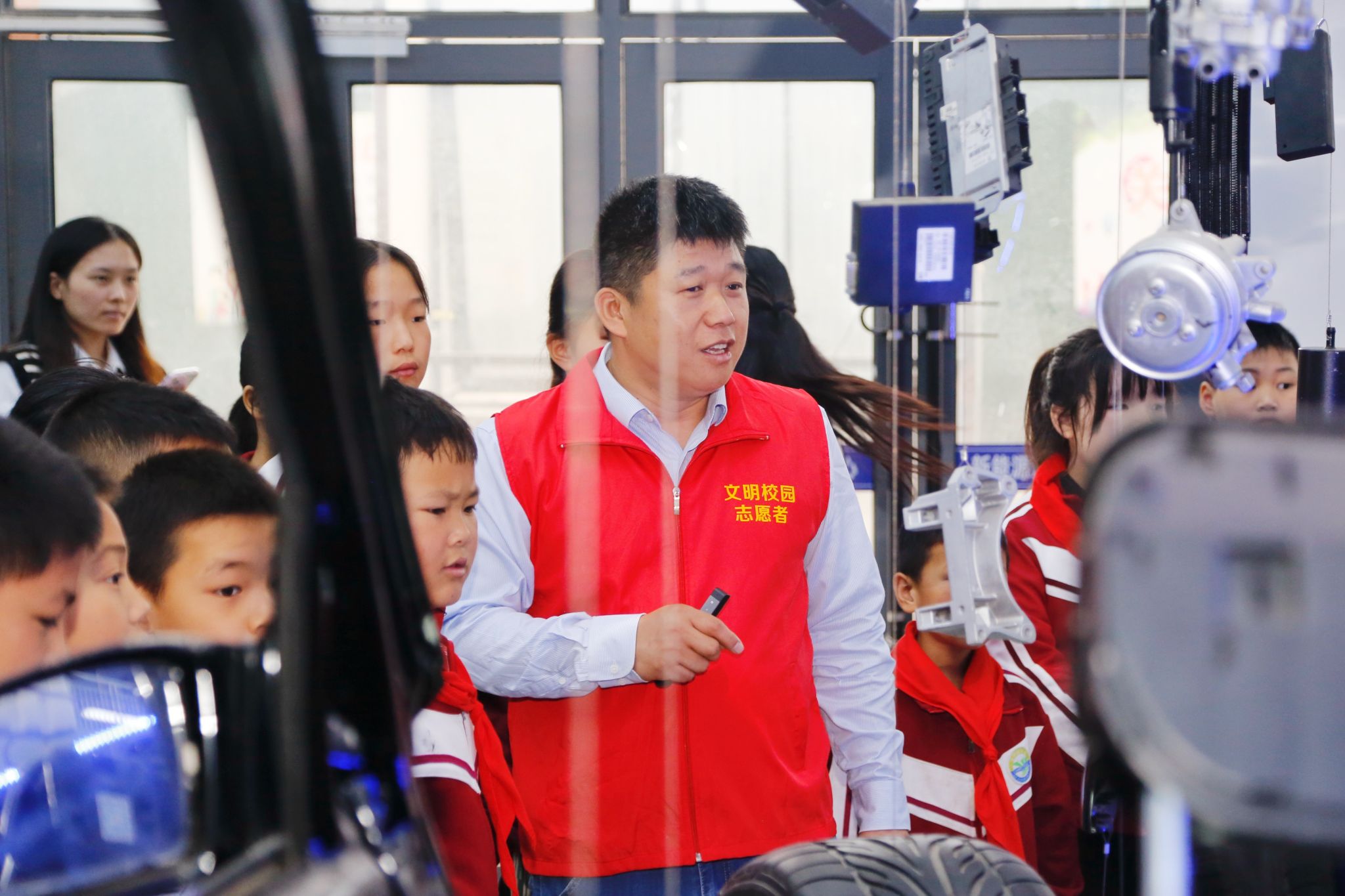 在汽车实训楼,教学负责人带领志愿者给老师和学生们进行讲解实训设备,并邀请同学们亲身体验网红汽车。在科技制造楼,志愿者们热情的给孩子们介绍工业机器人的设施设备,现场演示机器人的操作,让学生们上手体验,体会其中的乐趣。