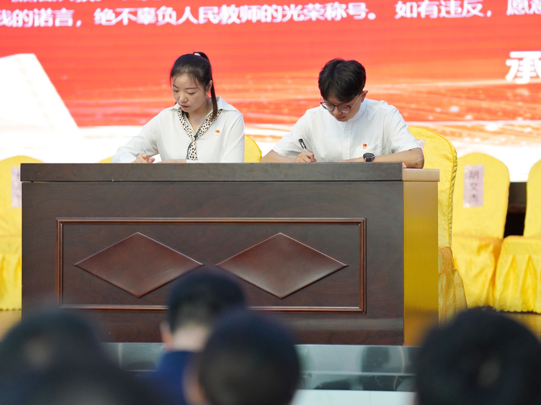 会上,学校为30名新进教师举行了隆重的入职仪式,他们庄严宣誓,依次上台签订师德师风承诺书,并进行了青蓝工程结对仪式。老师们纷纷表示,要以坚定的信念、饱满的热情、扎实的学识,为学生撑起一片广阔的天空,共同为学校的繁荣发展贡献力量,为学生的未来铸就坚实基础。