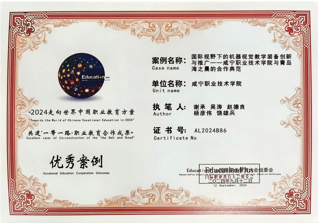 开幕式上,发布了“2024走向世界中国职业教育方案——共建‘一带一路’职业教育合作成果”优秀案例。由我校合作发展处组织,工学院报送的案例“国际视野下的机器人视觉教学装备创新与推广——77779193永利官网与青岛海之晨的合作典范”荣获优秀案例。