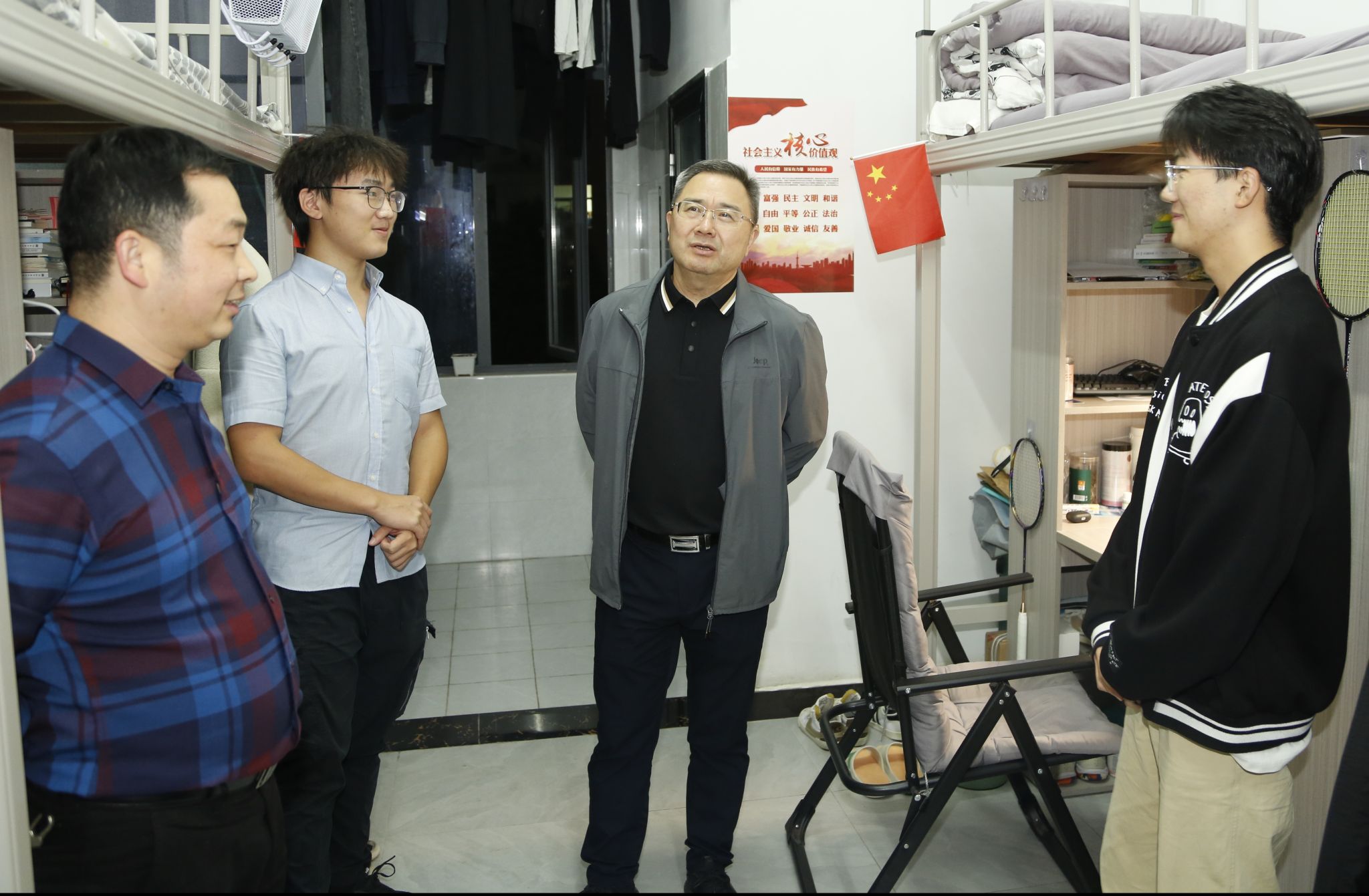 11月4日晚,校长陈红卫深入工学院和信息工程学院学生宿舍,看望中外合作办学项目班级学生并与学生亲切交流。
