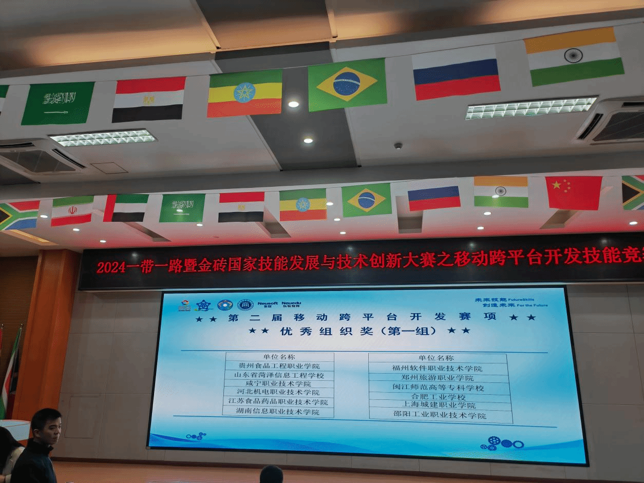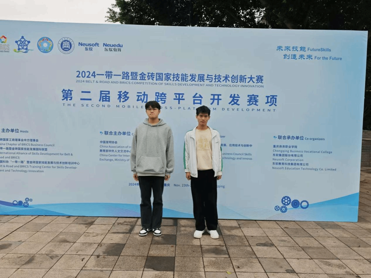 2024年11月25日,2024一带一路暨金砖国家技能发展与技术创新大赛第二届移动跨平台开发赛项在重庆商务职业学院举行。我校计算机应用技术专业学生蔡绍赋、陆安双双获得全国二等奖,学校荣获“最佳组织奖”单位称号。