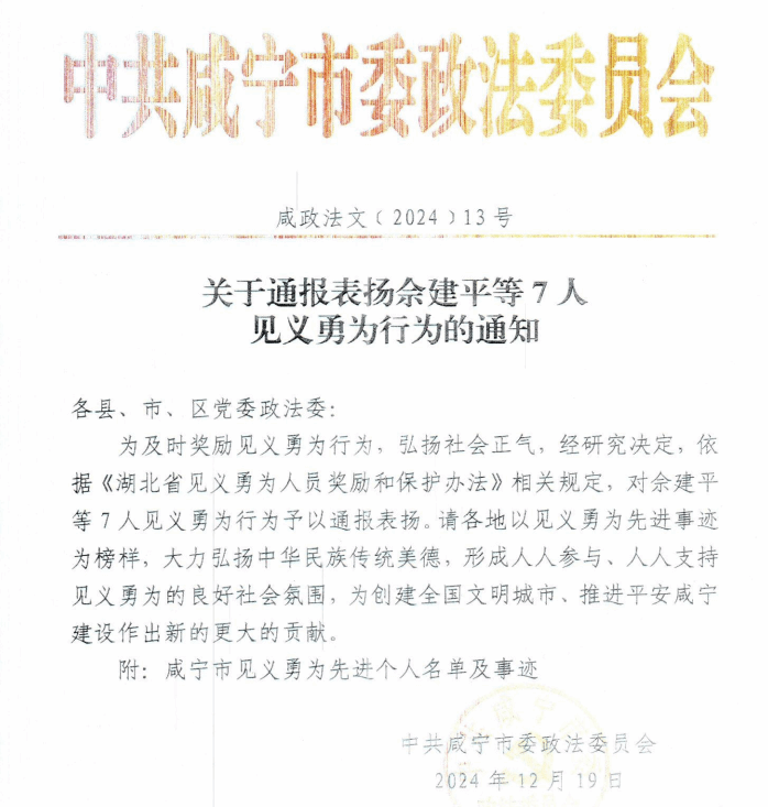 通知要求,全市各地应以见义勇为先进事迹为榜样,大力弘扬中华民族传统美德,形成人人参与、人人支持见义勇为的良好社会氛围,为创建全国文明城市、推进平安咸宁建设作出新的更大的贡献。