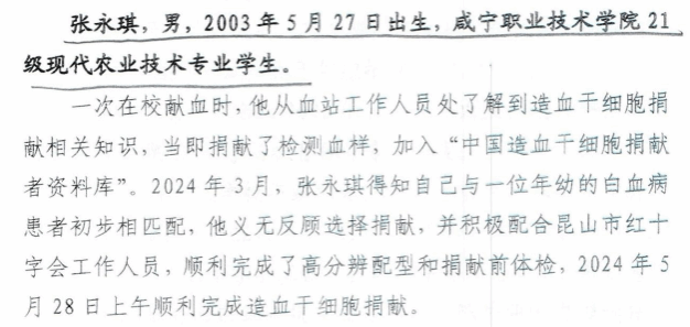 近日,咸宁市政法委印发《关于通报表扬佘建平等7人见义勇为行为的通知》,对2024年涌现出的一批见义勇为行为和个人进行通报表扬。我校21级现代农业技术专业学生张永琪捐献造血干细胞事迹被点名表扬。