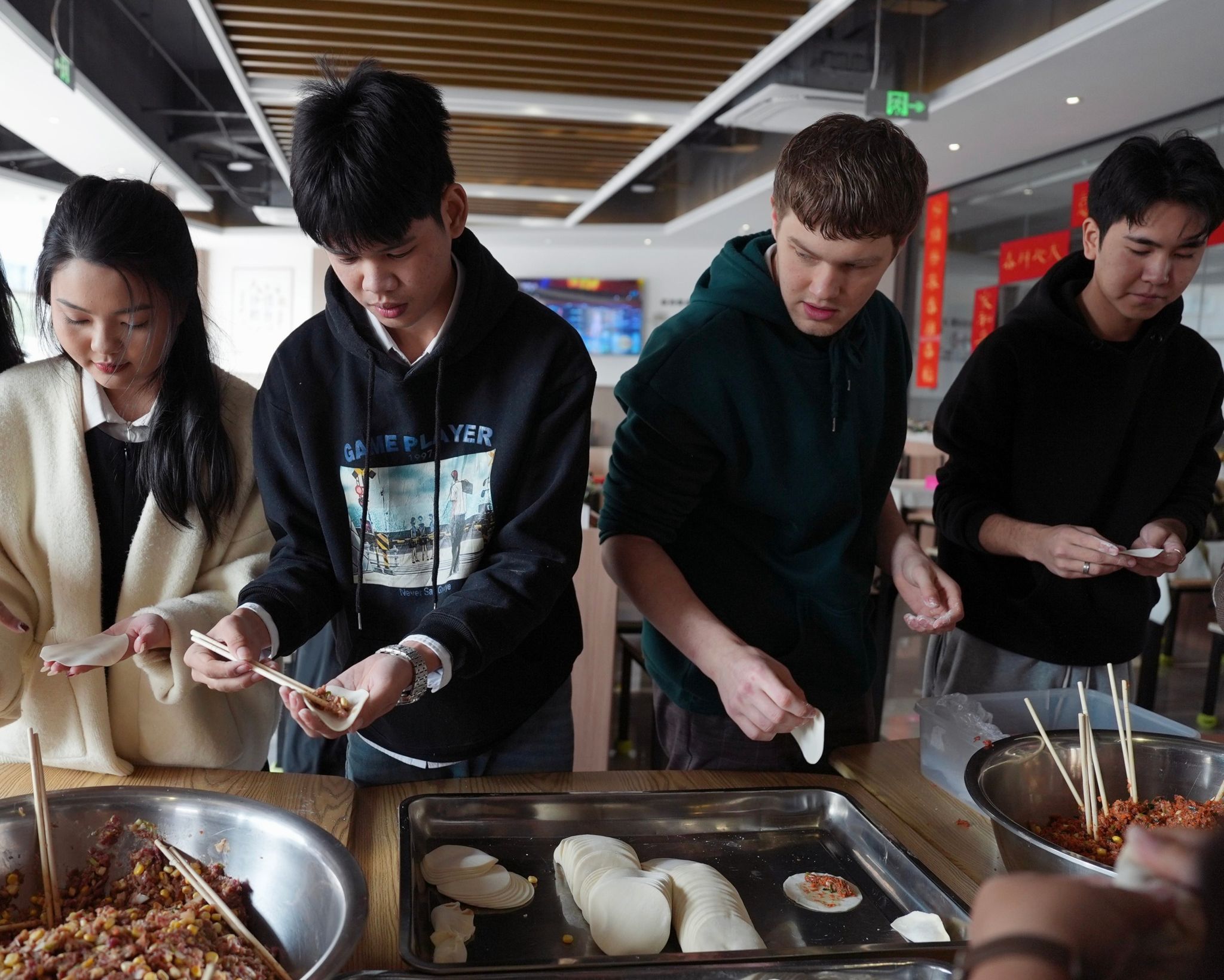 1月22日,宁静的我校校园里有一处地方热闹欢腾洋溢着浓厚的过年氛围,一场别开生面的国际生包饺子过年活动在这里欢乐上演。来自不同国家的国际生和老师齐聚一堂,亲手制作饺子,感受中国传统节日——过年的味道。