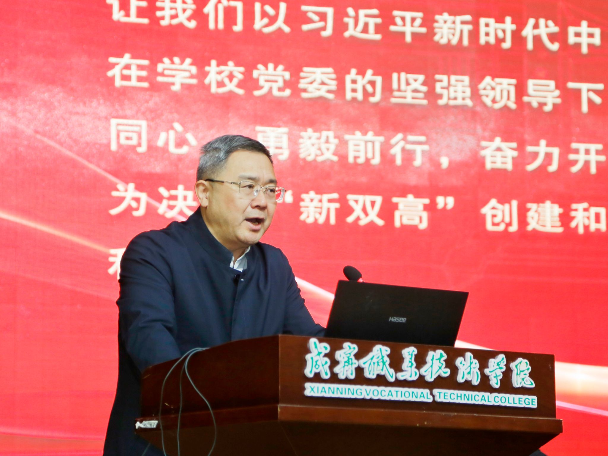 陈红卫以《锚定目标不放松奋楫笃行勇向前 全力推动学校向职业本科和“新双高”目标加速迈进》为题作2025学校工作报告。报告指出,2024年是咸宁发展历史上意义非凡、载入史册的一年,习近平总书记考察湖北、亲临咸宁,为全市人民带来了巨大鼓舞,也为我校“双高”创建注入了强劲动力。一年来,在省教育厅、市委、市政府的坚强领导下,学校坚持以习近平新时代中国特色社会主义思想为指引,全面贯彻党的教育方针,落实立德树人根本任务,在内涵建设、人才培养、开放办学、合作发展、治理能力、服务师生等方面成效显著,用实干和奋斗谱写了学校高质量发展的崭新篇章。