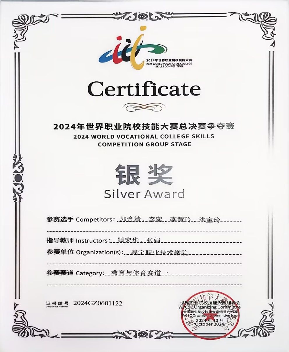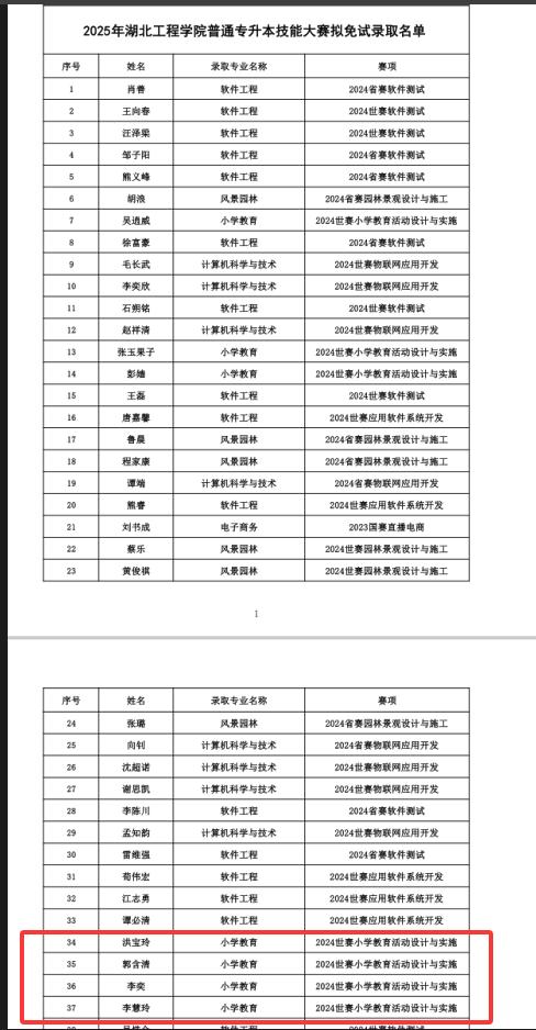 近日,湖北省教育厅公布2025年普通高等学校专升本免试录取名单,我校人文艺术学院2022级小学教育专业郭含清、李奕、李慧玲和洪宝玲四位同学在“世界职业技能大赛总决赛”赛项“教育与体育赛道”中获得银奖,全部获得技能大赛免试专升本资格,同时被湖北工程学院录取。