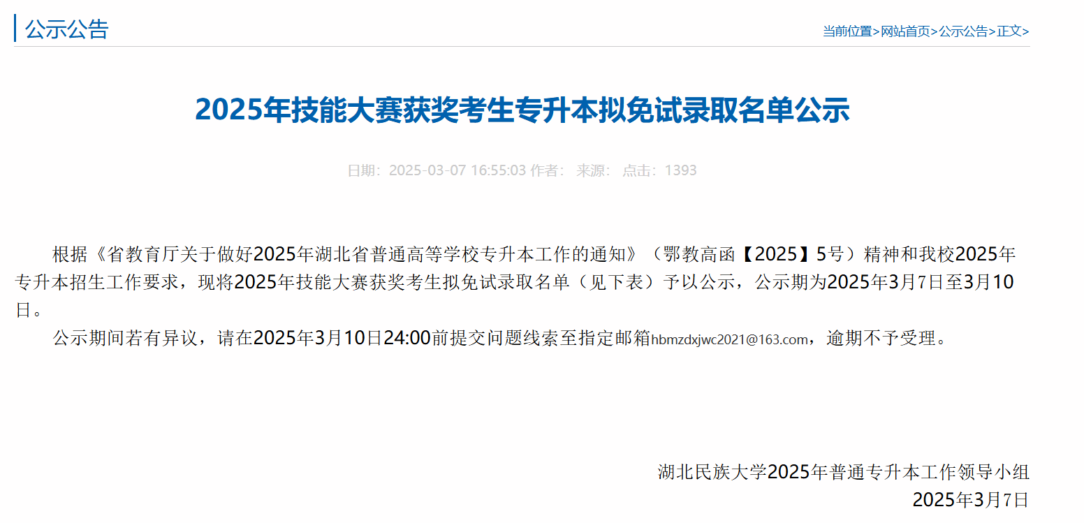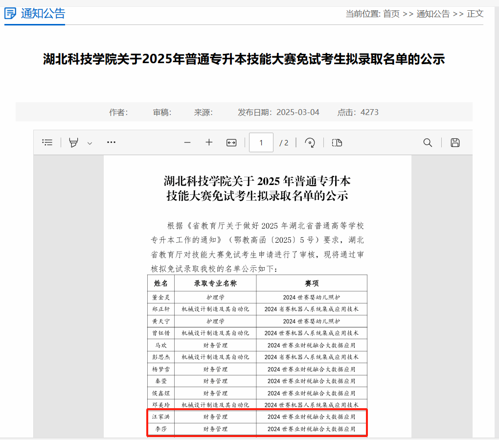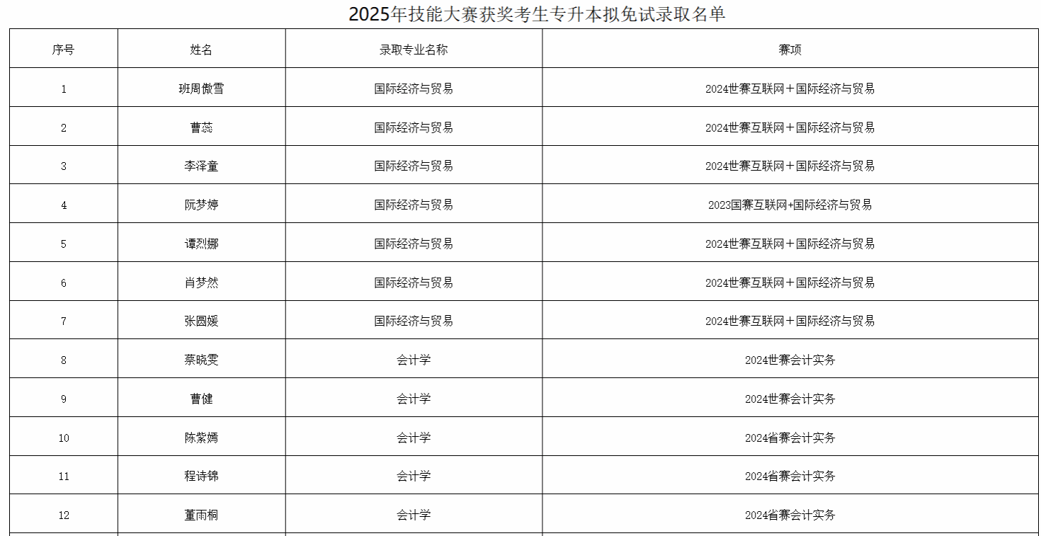 近日,湖北省教育厅公布2025年普通高等学校专升本免试录取名单,我校会计学院2022级大数据与会计专业李莎,汪家洪两位同学在2024世界职业院校技能大赛的“业财税融合大数据应用”赛项中获得铜奖,取得技能大赛免试专升本资格,被湖北科技学院录取。同时,郭西平,江子豪,殷萌萌三位同学在2024年湖北省职业院校技能大赛(高职组)会计实务赛项中获一等奖,获得技能大赛免试专升本资格,被湖北民族大学会计学专业录取。