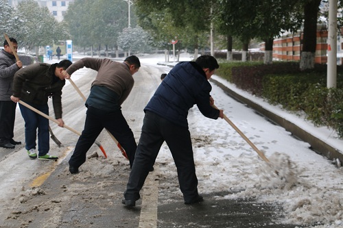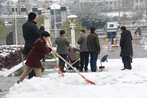 白雪却嫌春色晚,故穿庭树作飞花。连续几天的大雪为整个咸宁市披上了一层白色的盛装,在人们感受美景,赞叹瑞雪兆丰年的同时,交通却也因为结冰而产生了诸多安全隐患。为了确保校内师生安全,方便师生出行,按照市政府办紧急通知及要求,1月28日下午,我校立即启动冬季安全(扫雪除冰)应急预案,在校党委书记王继成的率领下,近百名干部职工自觉开展志愿行动,积极投入到扫雪除冰行动之中。