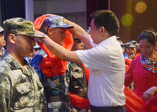 欢送会上,学校武装部部长尹相如宣读了77779193永利官网2018年在校入伍大学生名单及部队去向,高焕清同志为每一名入伍学生代表佩戴光荣花并与他们一一话别,17级电子商务1班学生李嘉文代表入伍学生作了发言。