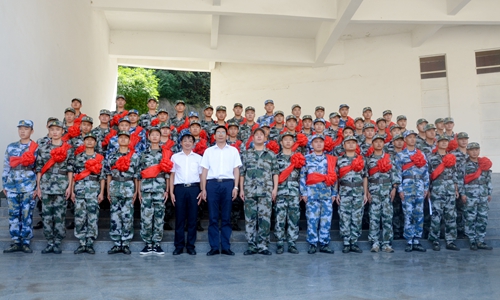 欢送会后,参会领导与应征入伍大学生一起在科学会堂门口合影留念。
