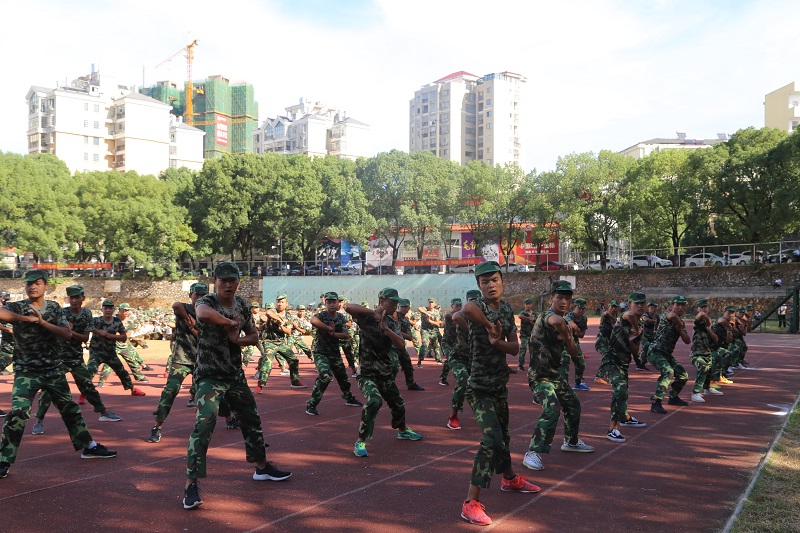 军训汇报表演暨开学典礼在庄严的国歌声中拉开帷幕。2018级新生在教官的带领下迈着整齐的步伐、喊着嘹亮的口号依次从主席台经过接受检阅。人文艺术学院、健康管理学院新生分别表演了军体拳和警卫拳,同学们动作刚健,凌厉精炼、气势如虹,为全校师生提交了一份满意的军训答卷。