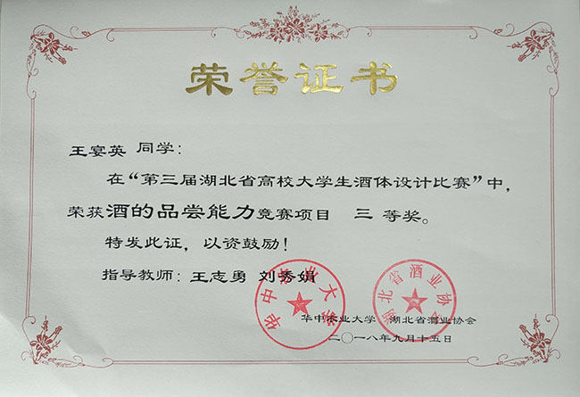 近日,第三届“湖北省大学生酒体设计大赛”在华中农业大学生科院顺利举办。我校生物工程学院由王志勇、刘秀娟两位老师带领周年涛、王宴英二位同学参赛,经过激烈角逐,再次为我校争得多项荣誉。
