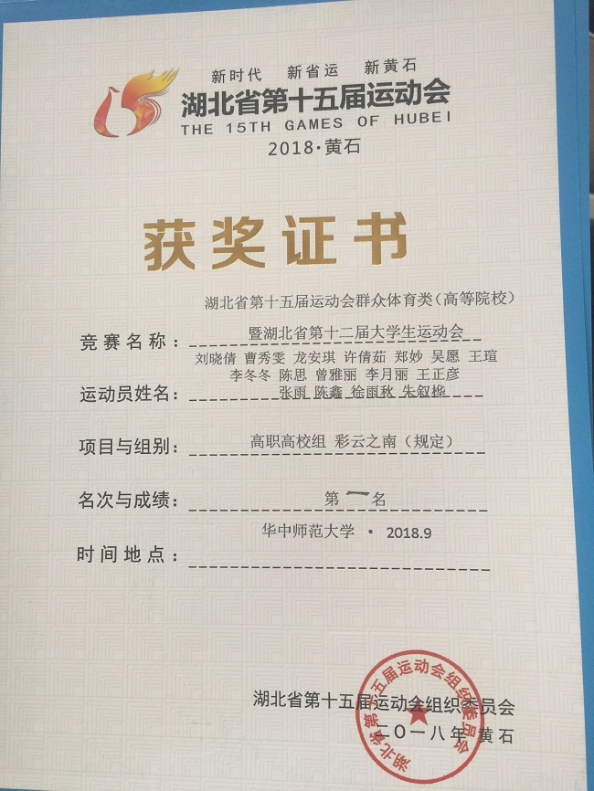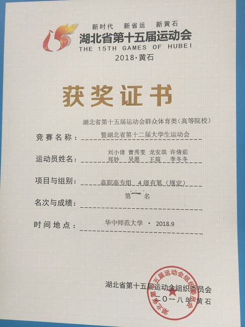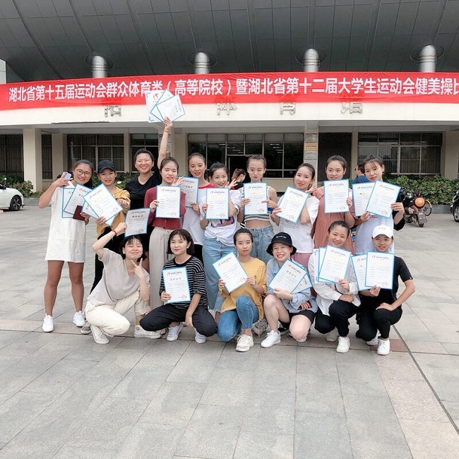 本次比赛是由湖北省人民政府主办,湖北省教育厅、湖北省体育局承办。共有华中科技大学、华中师范大学、华中农业大学,武汉职业技术学院、湖北财税职业技术学院等多家省内本科及高职院校参加。我校报名参加了高职高专组大众健美操和时尚健身操中国风健身操舞两项比赛,在比赛中我校健儿遵守赛场纪律、尊重裁判、尊重对手,顽强拼搏,取得两个单项第一名的优异成绩。