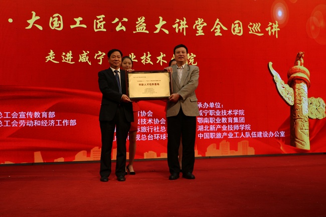 宣讲后,全国劳模、大国工匠许启金向我校赠送创新产品;全国五一劳动奖章获得者、中国书法家协会会员孔繁敬向我校赠送书法作品《中国力量》;中国职工国际旅行社总社张西昶总经理向我校颁发“创新人才培养基地”牌匾;校长高焕清为大国工匠颁发了客座教授聘书。