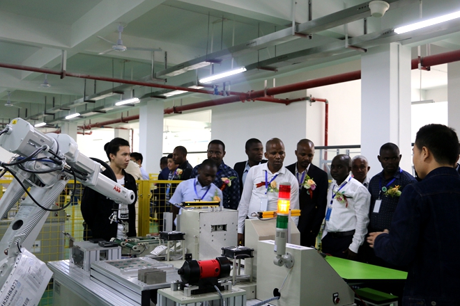 来自委内瑞拉的学员代表雷内·奥古斯都先生发表诚挚感言,对培训满怀期待。整个仪式现场暖意融融,氛围庄重浓烈,开班典礼在校领导集体为学员佩戴校徽和合影中谢幕。接着校领导陪同学员参观了学校校史馆、工业机器人实训基地和汪京元艺术大师工作室,为增进了解、促进和扩大今后的友好合作奠定了坚实基础。
