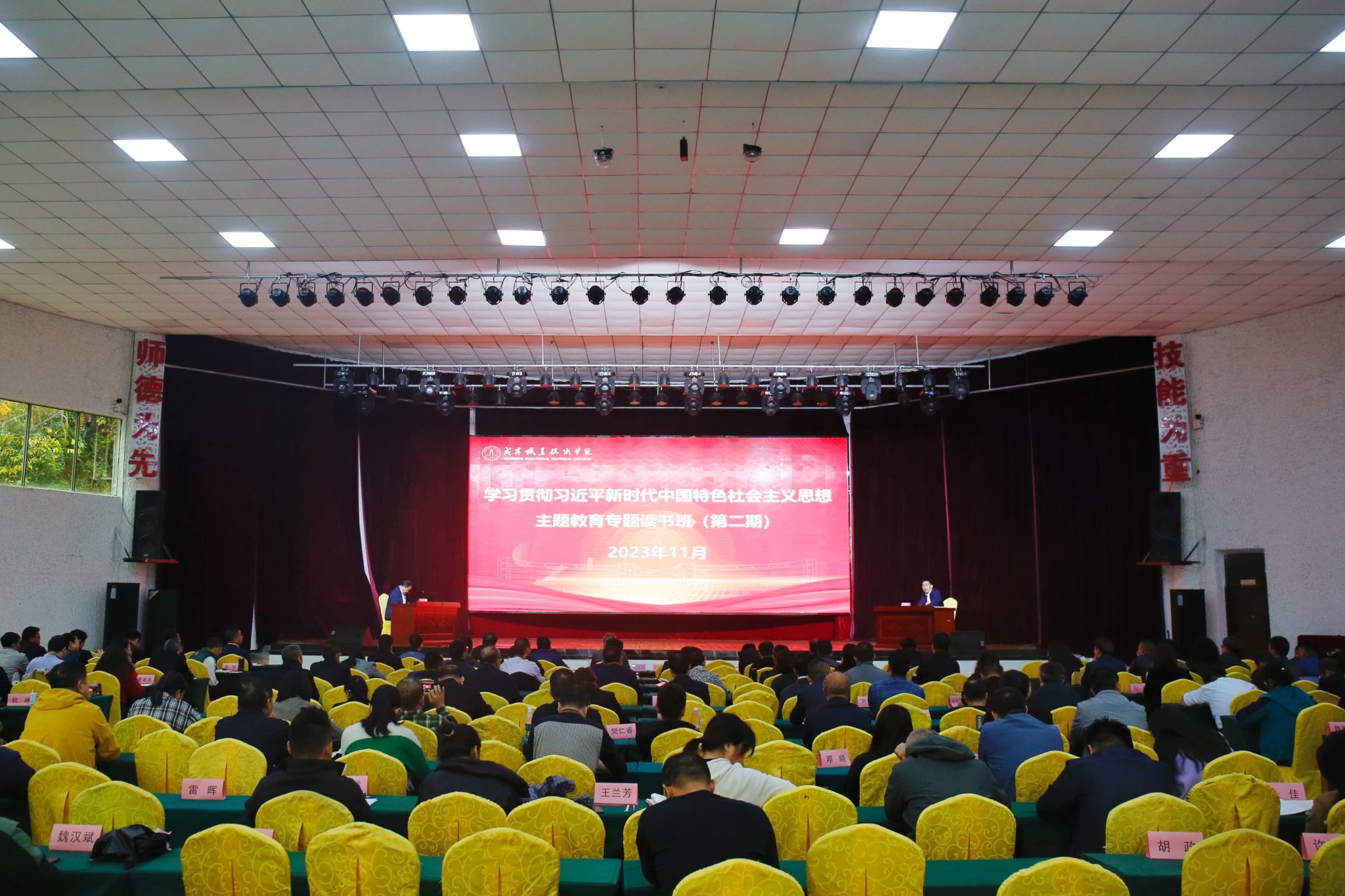 本期读书班为期四天,以专题辅导讲座、小组交流研讨、集中交流研讨、个人自学等形式开展,全校中层正职及以上干部参加学习。