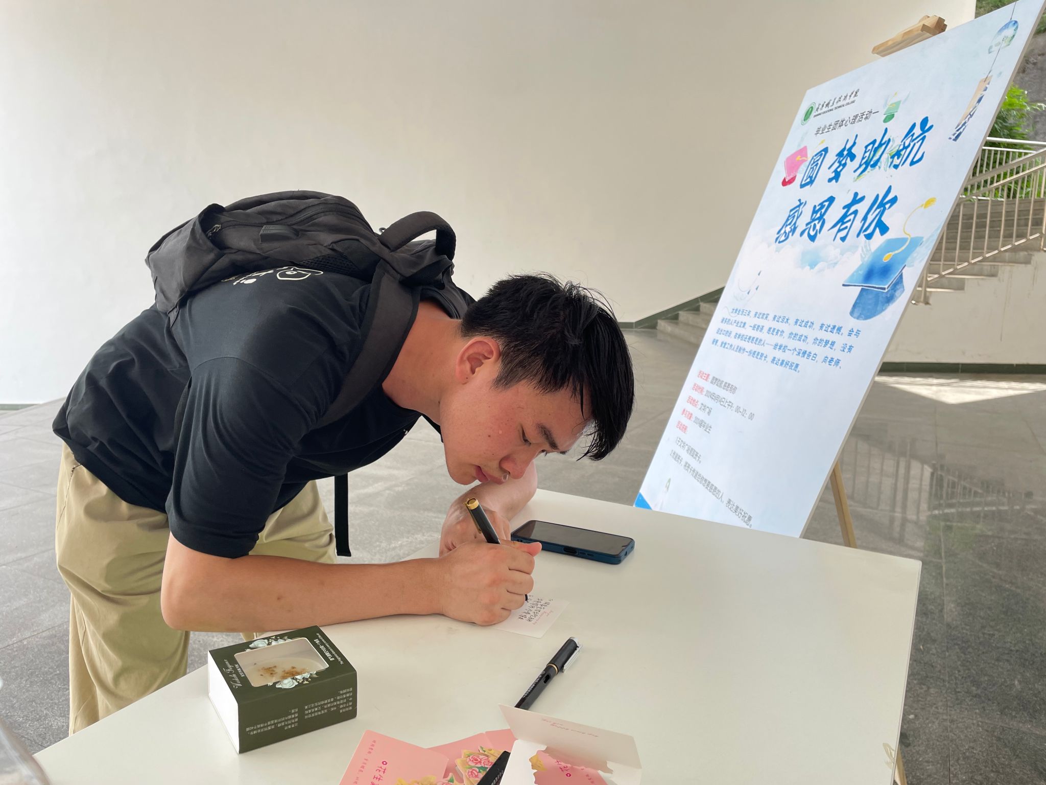 本次活动共由两个团体心理活动组成,分别为圆梦助航 感恩有你--感恩贺卡制作和“香”约我校 “味”梦远航--桂花香片领取。 大学生活三年,有过欢笑,有过泪水,有过成功,有过遗憾,一纸寄语,感恩有你,在离别之际为想要告白的人制作一份感恩贺卡表达美好祝愿。来自健康管理学院的李同学写到:致敬健康管理学院的所有老师,三年时间学贵得师,亦贵得友;祝丹枫食堂三楼烧盘饭阿姨之子高考金榜题名,考一个好成绩,祝阿姨身体健康,万事如意;祝身边所有的朋友们,一路顺风,前程似锦。李同学们用最质朴的语言表达对学校和身边人最真挚的爱与感恩。