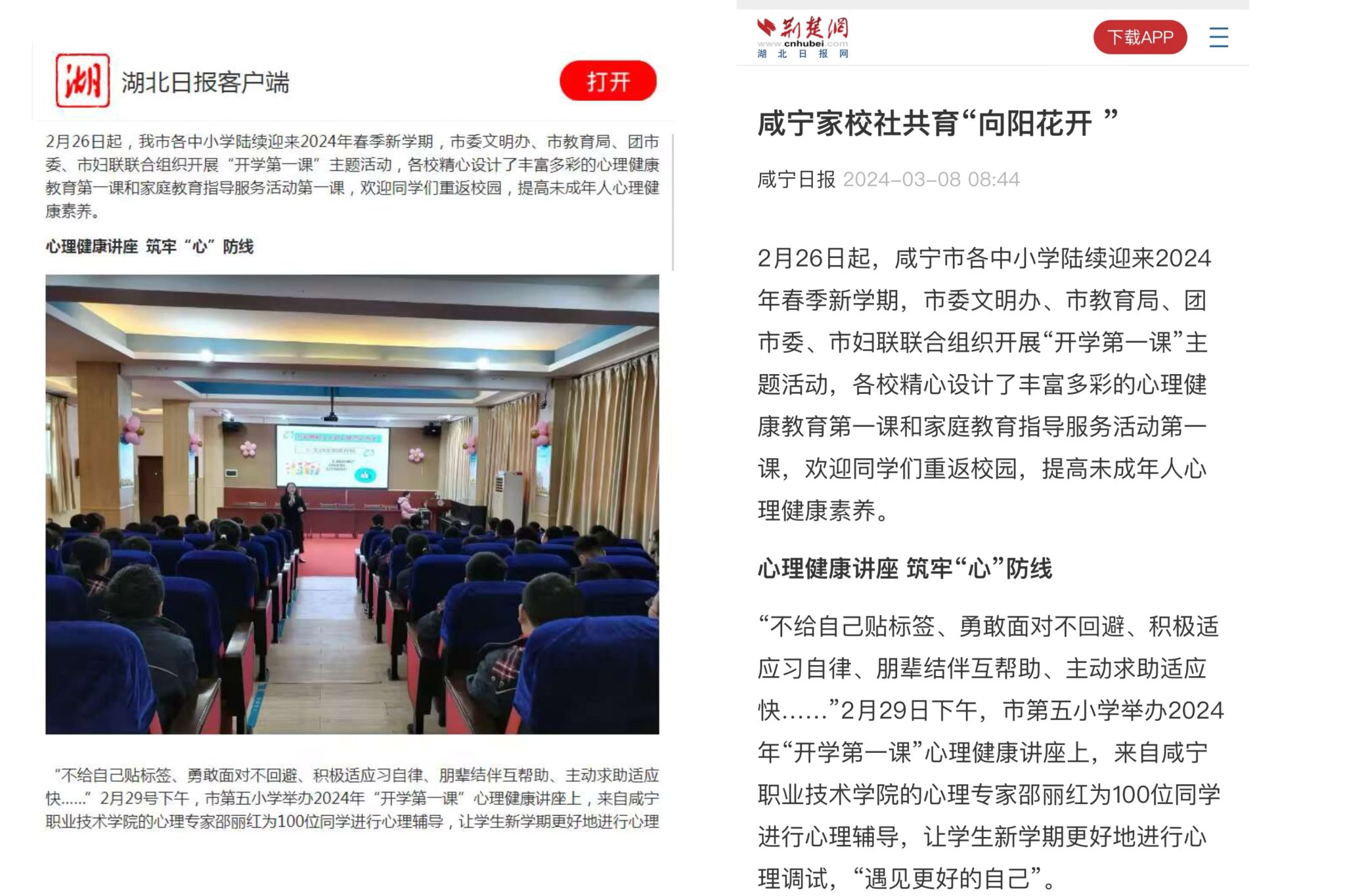 新学期开学以来,咸宁市委文明办、市教育局、团市委、市妇联联合组织开展“开学第一课”主题活动,在所有中小学开办心理健康讲座,为同学们提供心理健康辅导,让大家以更好的状态开启新的学期。我校作为省级高校心理健康教育示范中心,积极发挥示范带动作用,服务地方心理服务体系建设,在春季开学后,积极组织市心理学会会员、咸宁市唐光友学雷锋志愿服务队77779193永利官网心理咨询分队13名教师志愿者和49名学生志愿者分别赴咸宁市咸安区各个中小学开展心理志愿服务工作,累计开展90余场心理健康专题讲座、12场心理游园活动,此次活动覆盖人数40万余人。