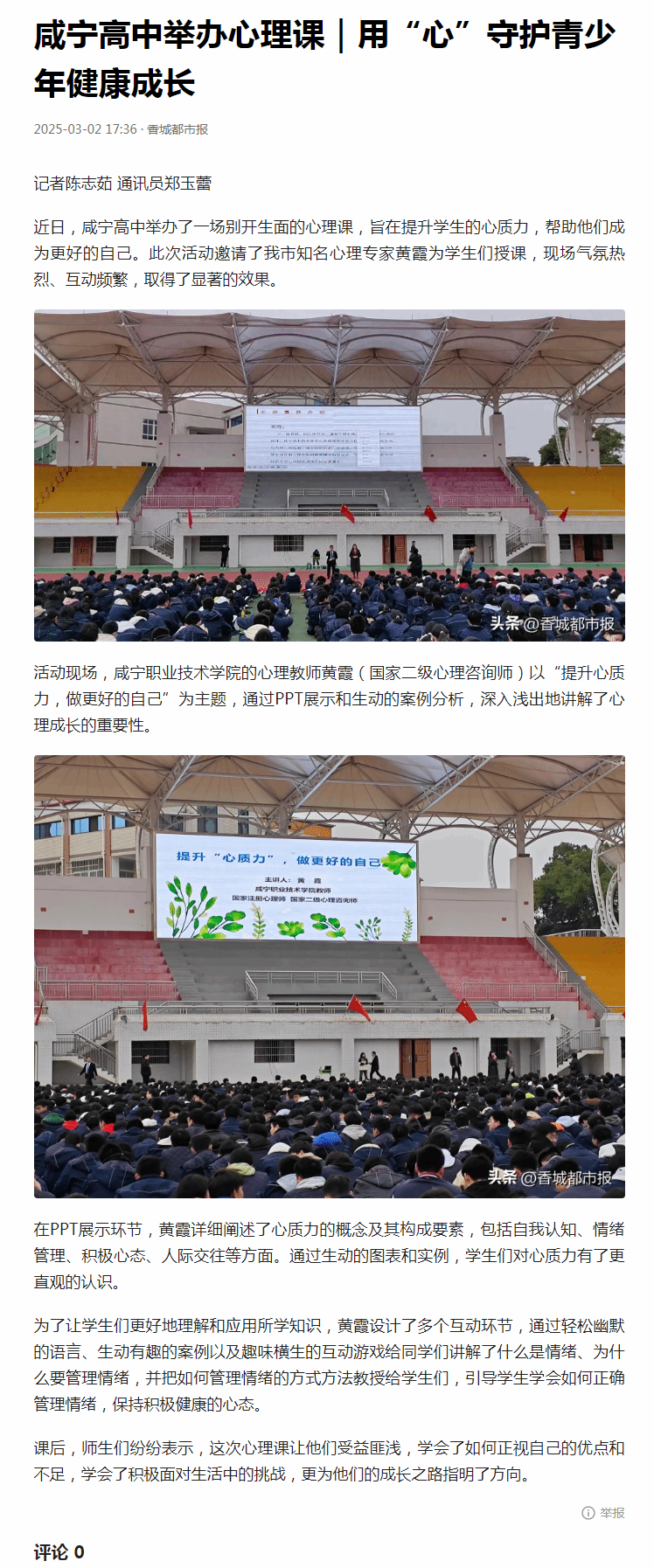 【香城都市报】黄霞 咸宁高中举办心理课|用“心”守护青少年健康成长